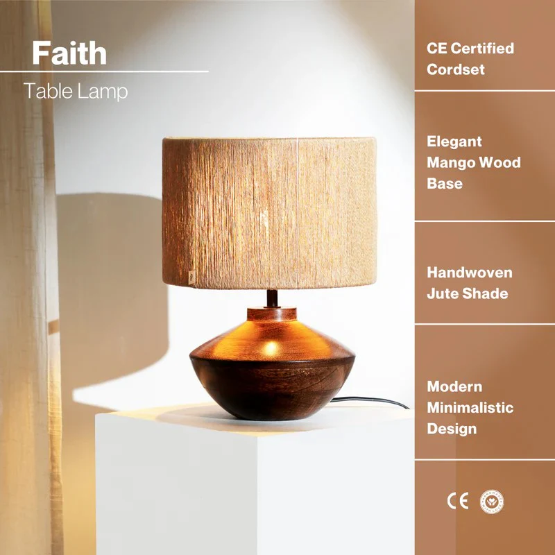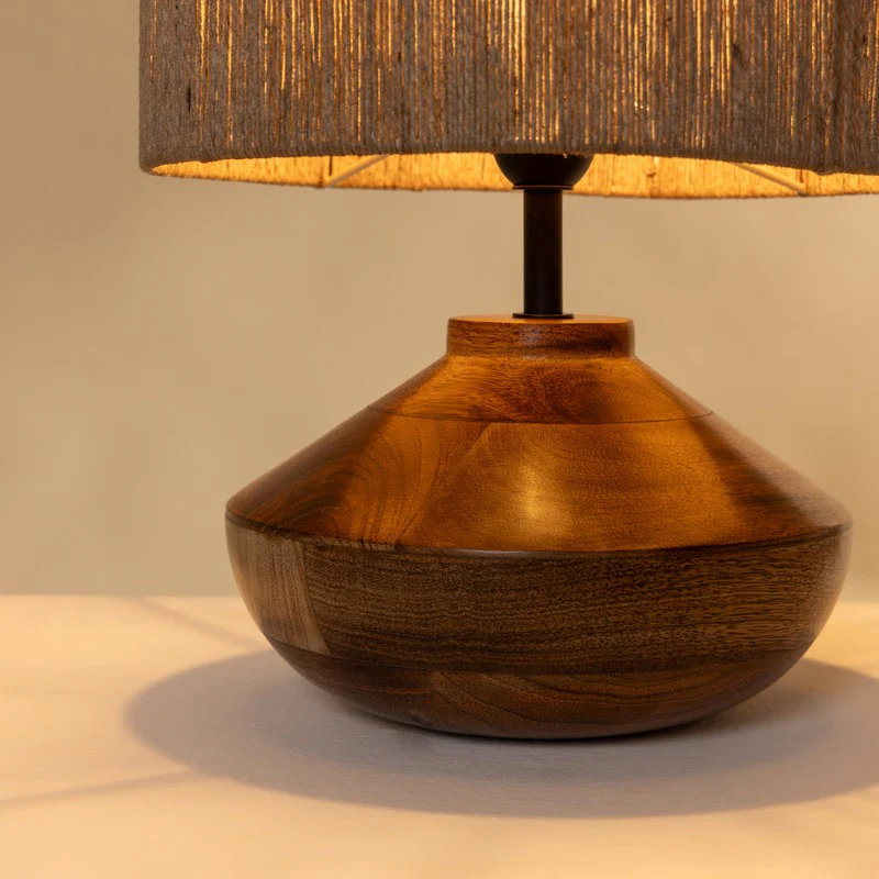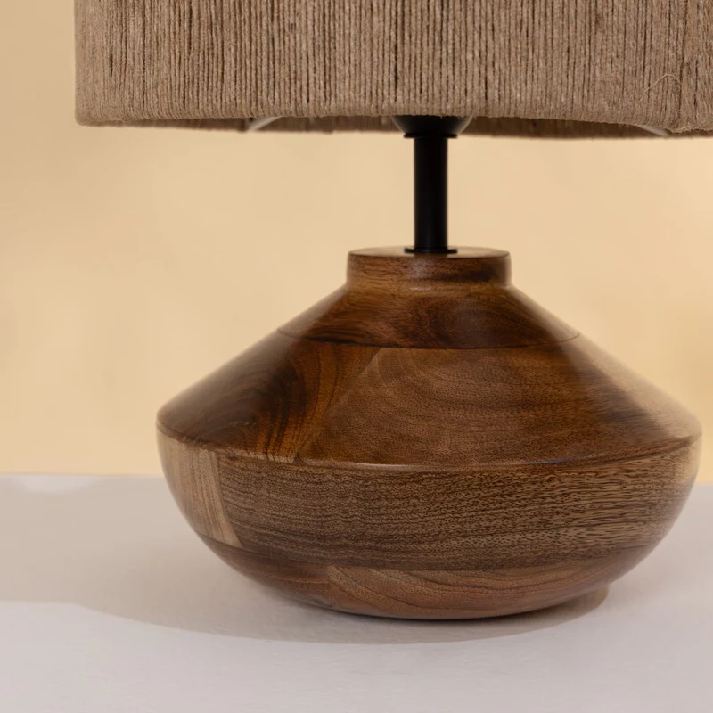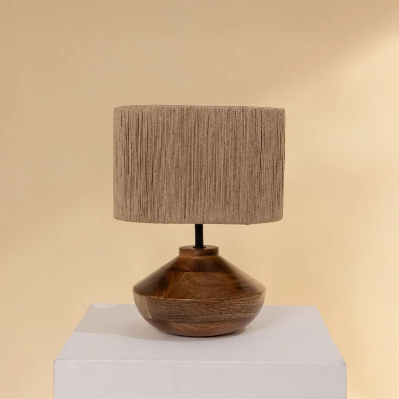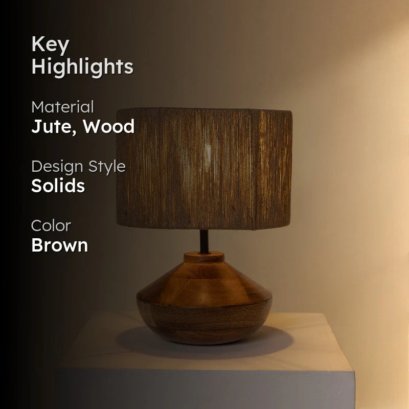 Hey there! Ever wanted to add a touch of warmth to your space? This table lamp's got you covered. With its earthy brown jute shade and solid wooden base, its like a cozy campfire in the middle of your living room. Its got that classic shape we all love, but with a modern twist. The light it casts? Absolutely dreamy. Perfect for those late-night reads or just setting the vibe when you're chilling. And lets be honest, who doesnt love a little rustic charm? Imagine this beauty on your side table, the soft glow wrapping you like a warm blanket. Bliss!